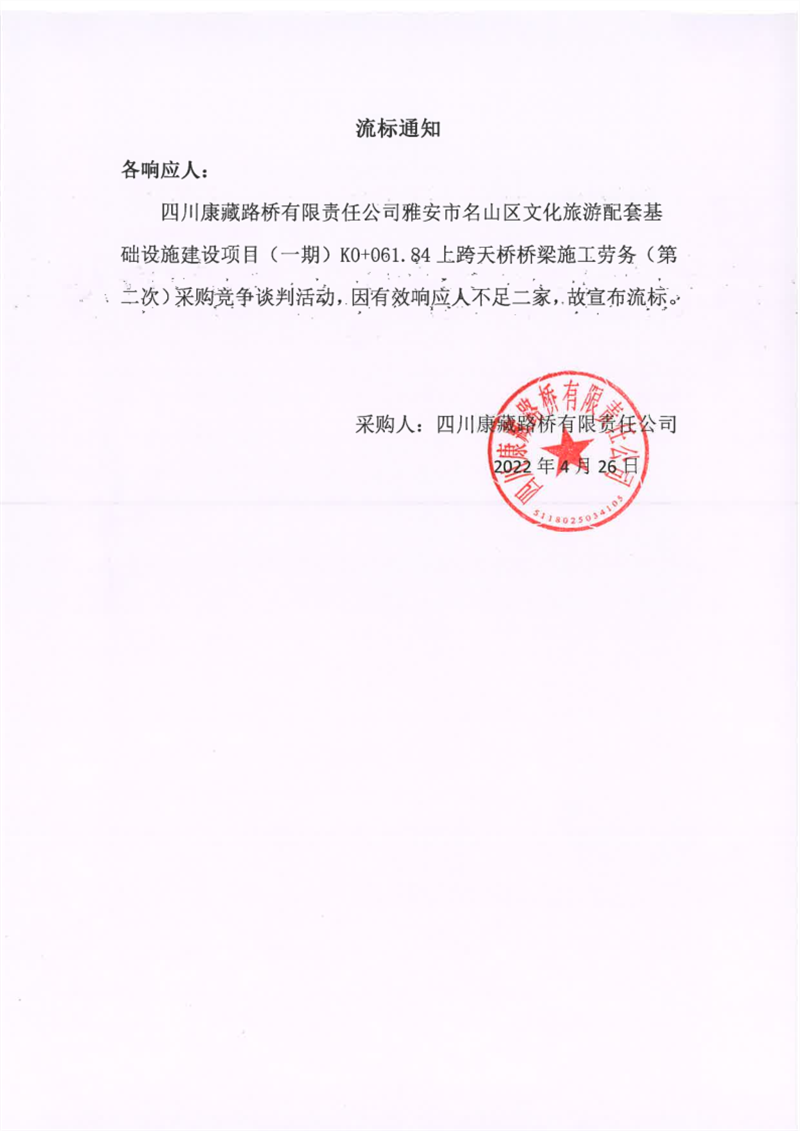 四川康藏路桥有限责任公司雅安市名山区文化旅游配套基础设施建设项目(一期)K0+061.84上跨天桥桥梁施工劳务(第二次)流标通知