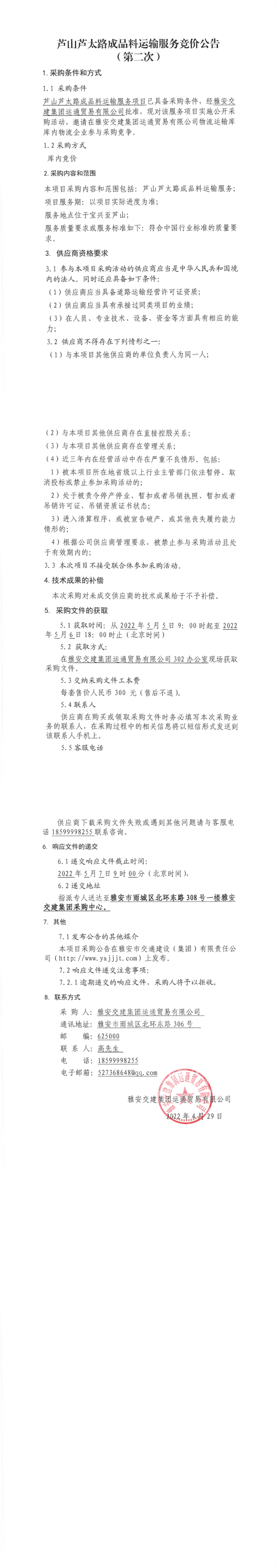 米兰体育-米兰(中国)官网 运通贸易有限公司芦山芦太路成品料运输服务竞价公告(第二次)