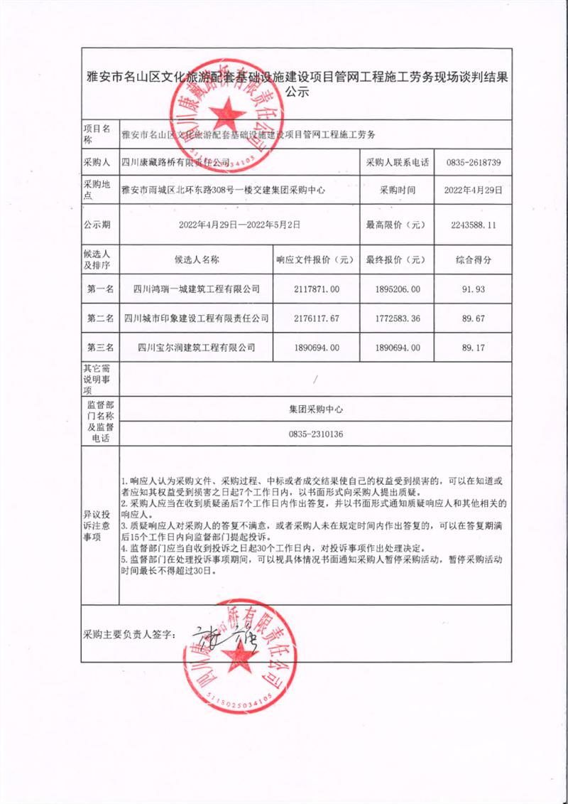 四川康藏路桥有限责任公司雅安市名山区文化旅游配套基础设施建设项目管网工程施工劳务现场谈判结果公示