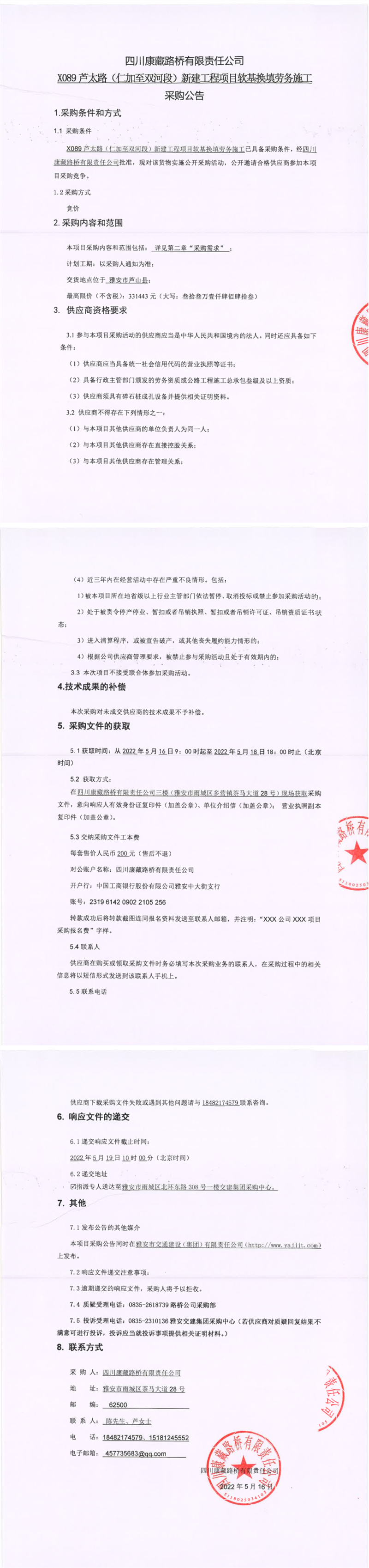 四川康藏路桥有限责任公司X089芦太路(仁加至双河段)新建工程项目软基换填劳务施工采购公告