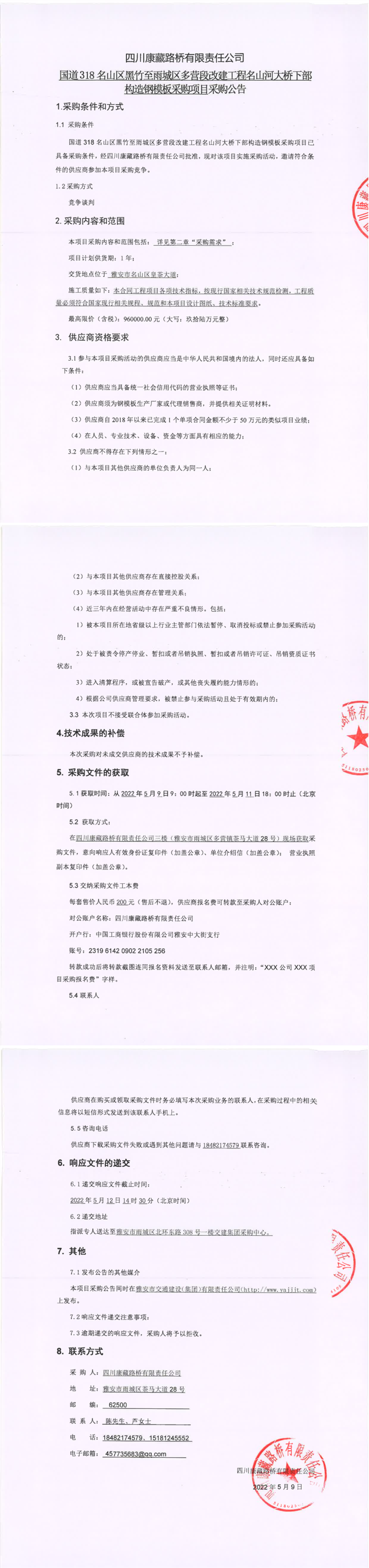 四川康藏路桥有限责任公司国道318名山区黑竹至雨城区多营段改建工程名山河大桥下部构造钢模块采购项目采购公告