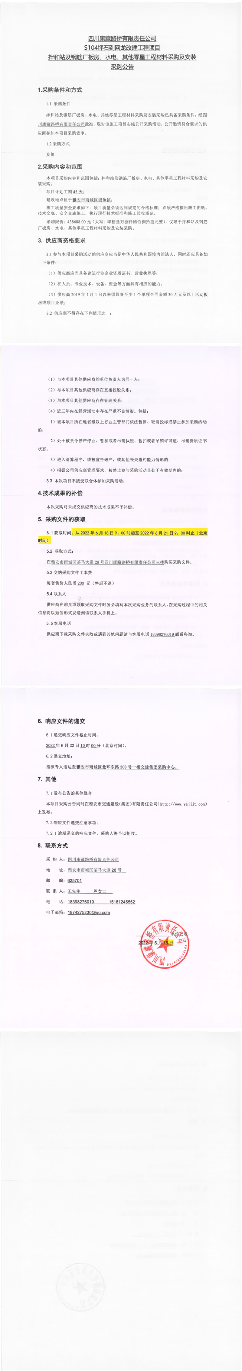 四川康藏路桥有限责任公司S104坪石到回龙改建工程项目拌和站及钢筋厂板房、水电、其他零星工程材料采购及安装采购公告