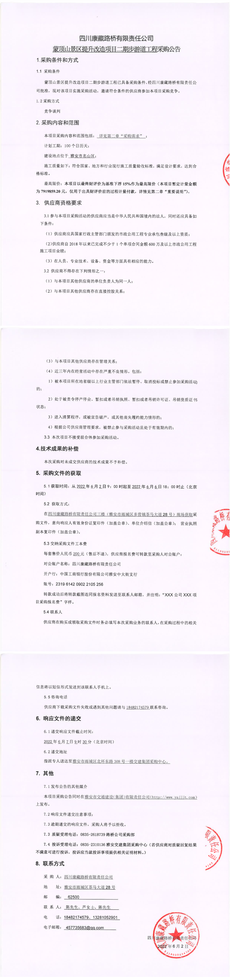 四川康藏路桥有限责任公司蒙顶山景区提升改造项目二期步游道工程采购公告