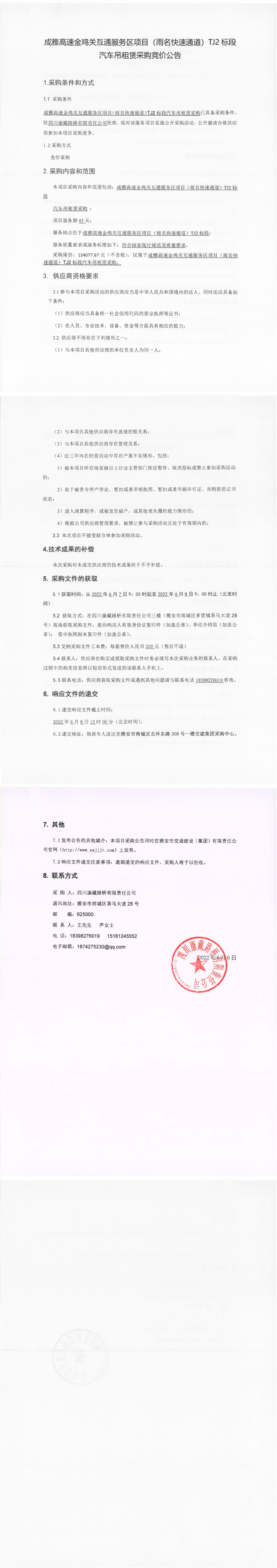 四川康藏路桥有限责任公司成雅高速金鸡关互通服务区项目(雨名快速通道)TJ2标段汽车吊租赁采购竞价公告