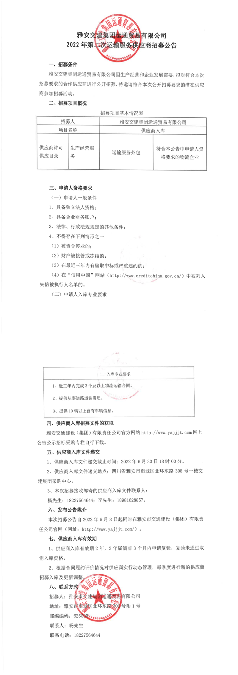 物流运输入库招募文件(2022年第二次)