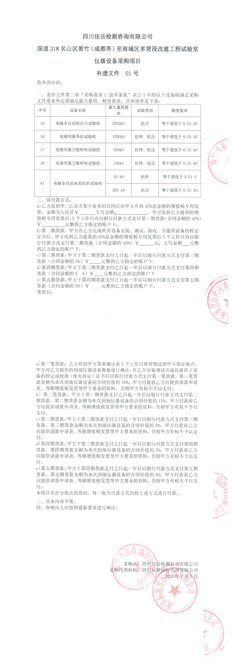 四川佳岳检测咨询有限公司国道318名山区黑竹(成都界)至雨城区多营段改建工程试验室仪器设备采购项目补遗文件01号