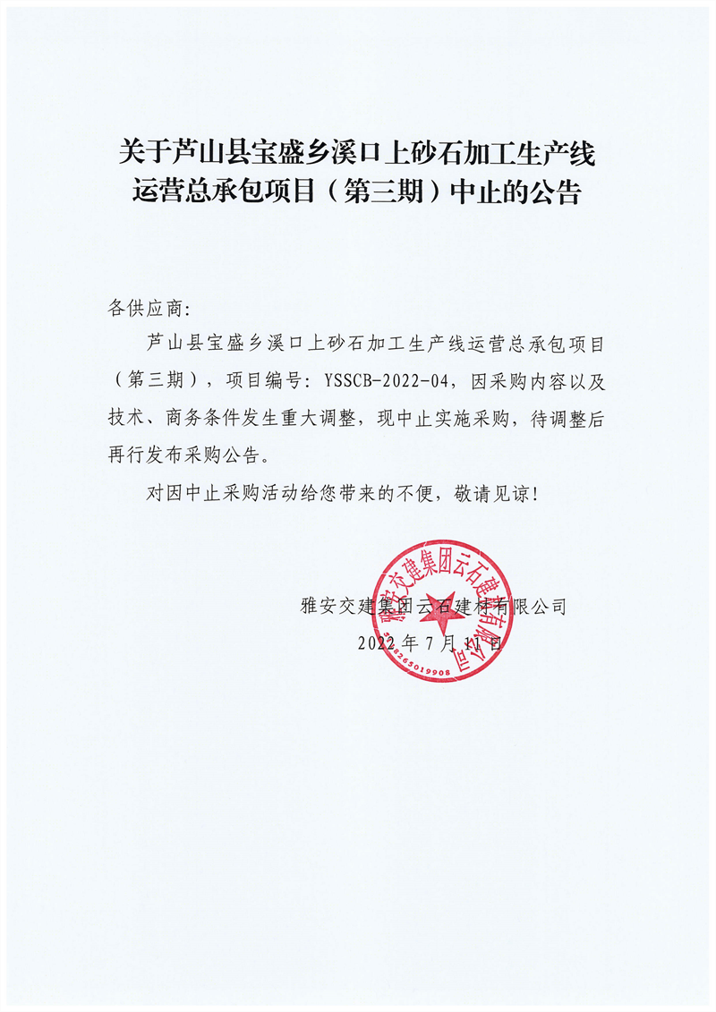 米兰体育-米兰(中国)官网 云石建材有限公司关于芦山县宝盛乡溪口上砂石加工生产线运营总承包项目(第三期)中止的公告