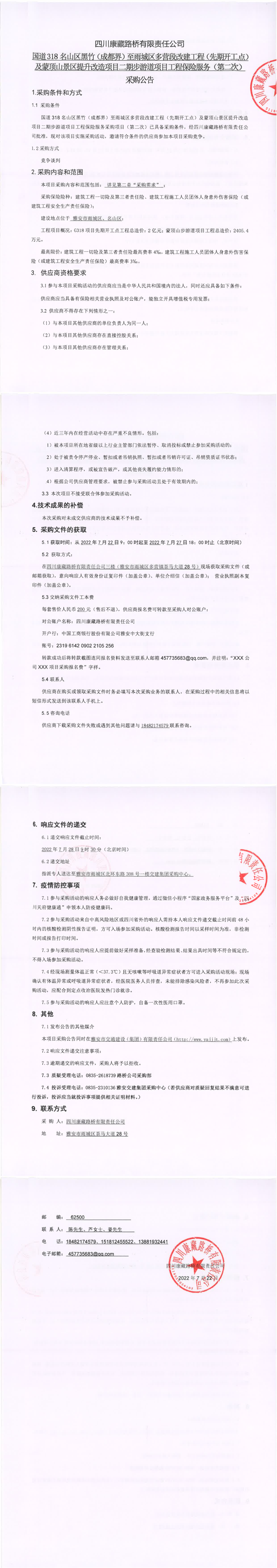 四川康藏路桥有限责任公司国道318名山区黑竹(成都界)至雨城区多营段改建工程(先期开工点)及蒙顶山景区提升改造项目二期步游道项目工程保险服务(第二次)采购公告
