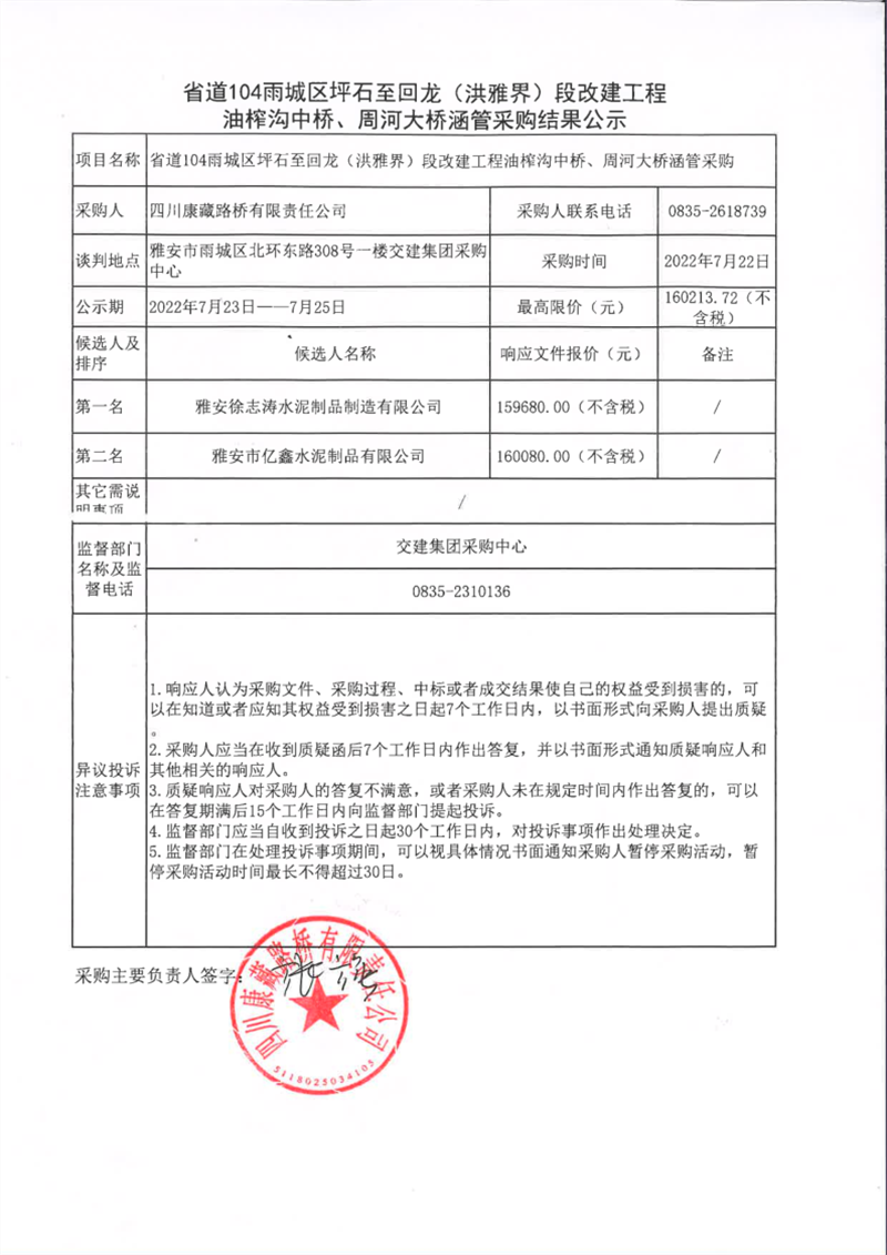 四川康藏路桥有限责任公司省道104雨城区坪石至回龙(洪雅界)段改建工程油榨沟中桥、周河大桥涵管采购结果公示