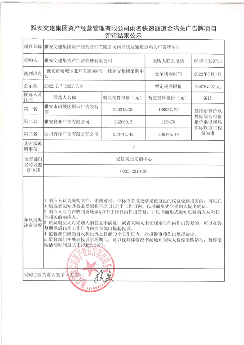 米兰体育-米兰(中国)官网 资产经营管理有限公司雨名快速通道金鸡关广告牌项目评审结果公示