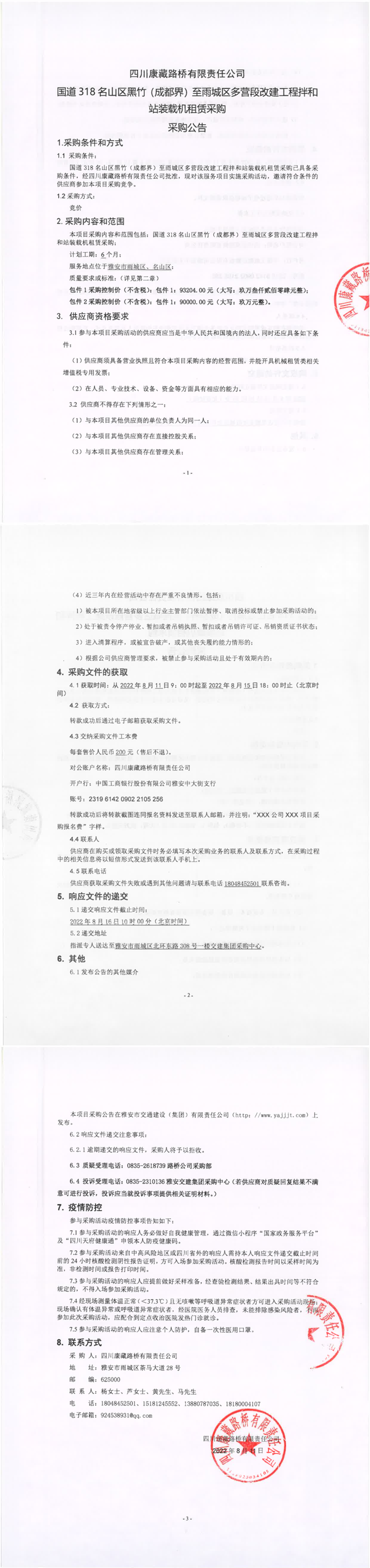 四川康藏路桥有限责任公司国道318名山区黑竹(成都界)至雨城区多营段改建工程拌和站装载机租赁采购公告