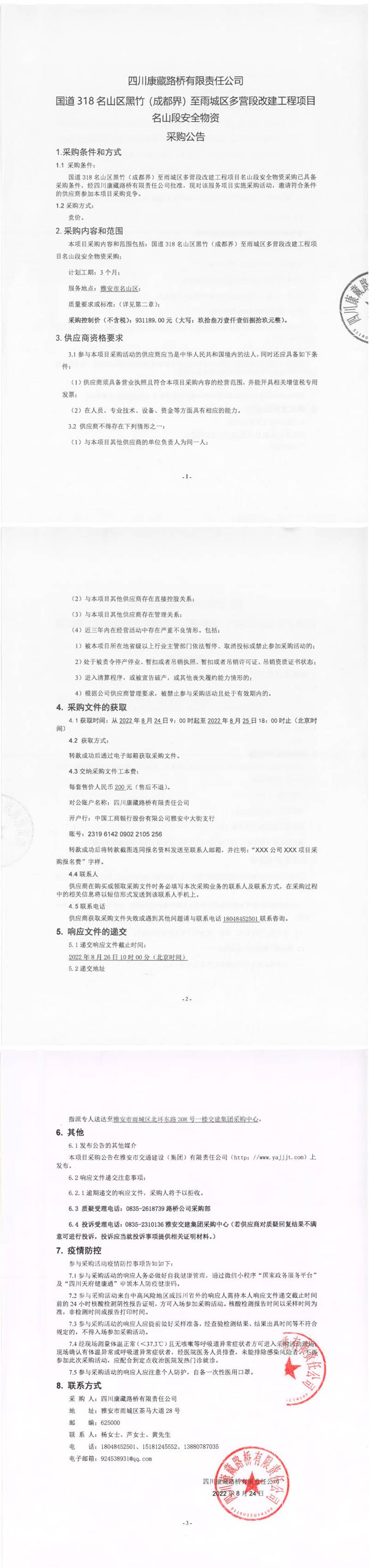 四川康藏路桥有限责任公司国道318名山区黑竹(成都界)至雨城区多营段改建工程项目名山段安全物资采购公告