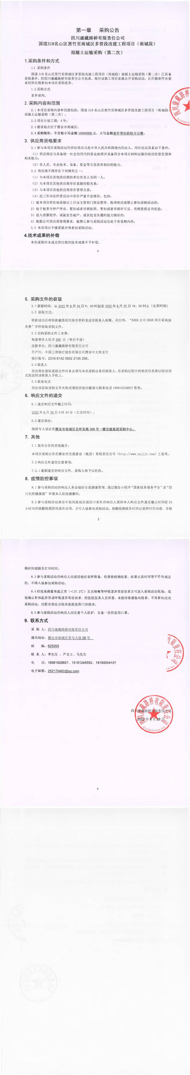 四川康藏路桥有限责任公司国道318名山区黑竹至雨城区多营段改建工程项目(雨城段)混凝土运输(第二次)采购公告