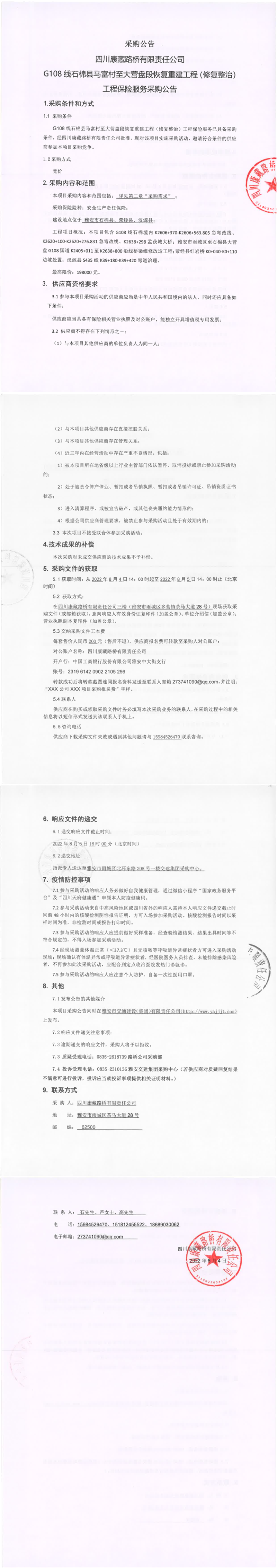四川康藏路桥有限责任公司G108线石棉县马富村至大营盘段恢复重建工程(修复整治)工程保险服务采购公告