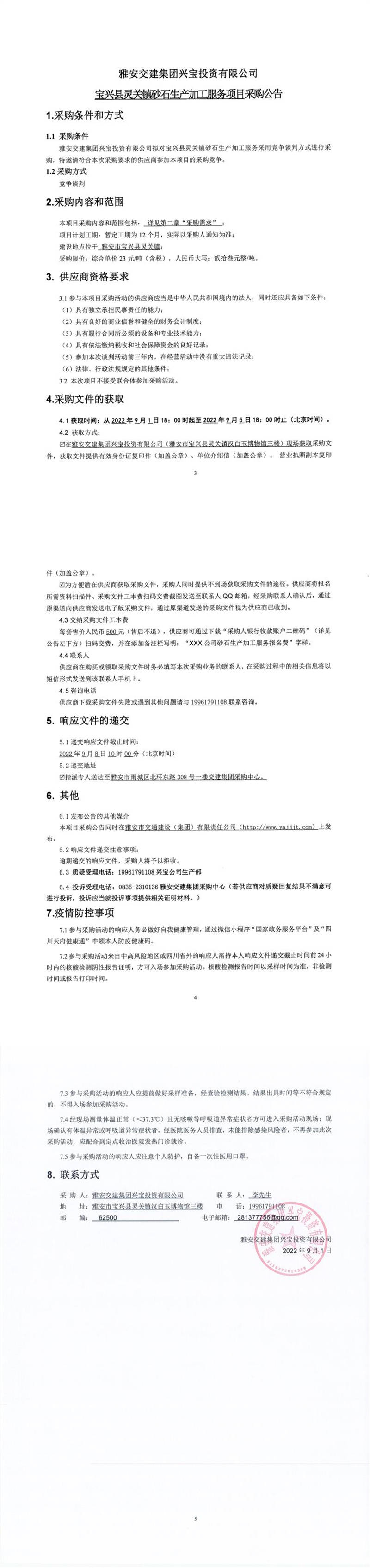 米兰体育-米兰(中国)官网 兴宝投资有限公司宝兴县灵关镇砂石生产加工服务项目采购公告