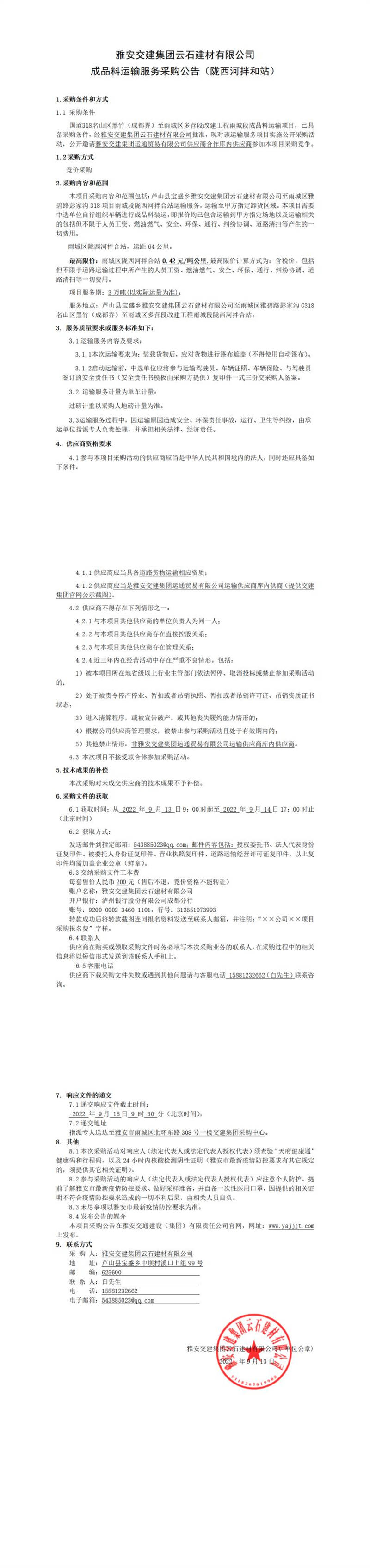 米兰体育-米兰(中国)官网 云石建材有限公司成品料运输服务采购公告(陇西河拌和站)
