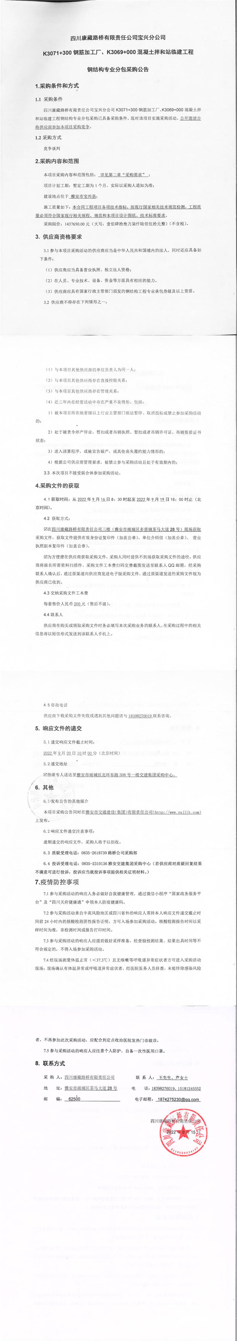 四川康藏路桥有限责任公司宝兴分公司K3071+300钢筋加工厂、K3069+000混凝土拌和站临建工程钢结构专业分包采购公告