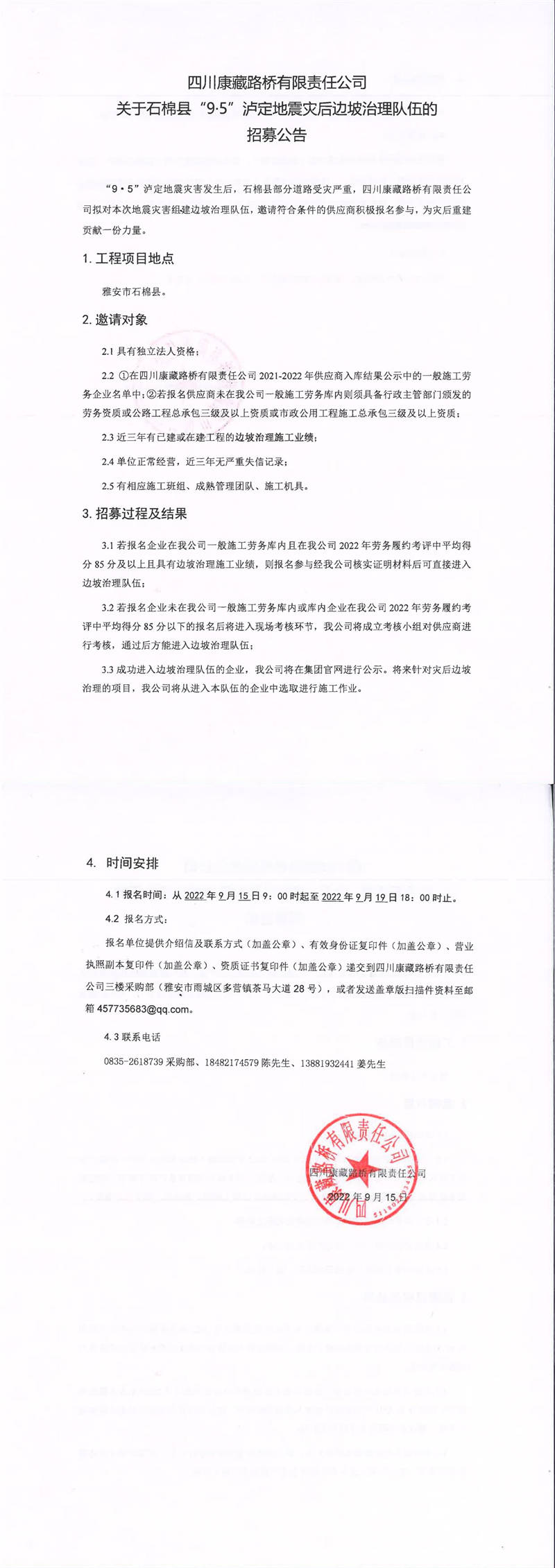 四川康藏路桥有限责任公司关于石棉县“9·5”泸定地震灾后边坡治理队伍的招募公告