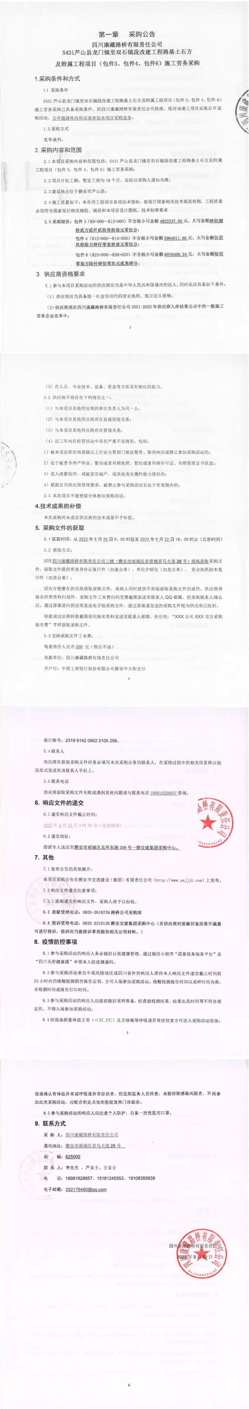 四川康藏路桥有限责任公司S431芦山县龙门镇至双石镇段改建工程路基土石方及附属工程项目(包件3、包件4、包件6)施工劳务采购公告