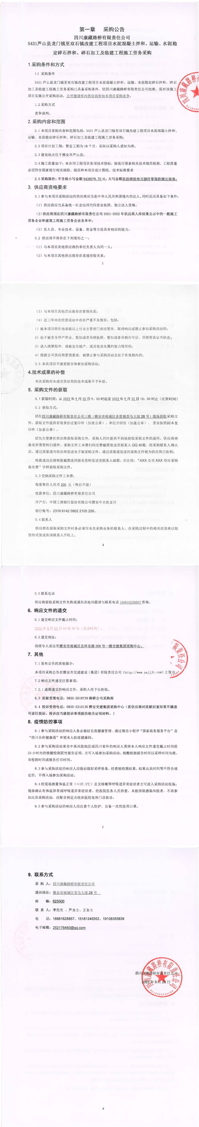 四川康藏路桥有限责任公司S431芦山县龙门镇至双石镇改建工程项目水泥混凝土拌和、运输、水泥稳定碎石拌和、碎石加工及临建工程施工劳务采购公告