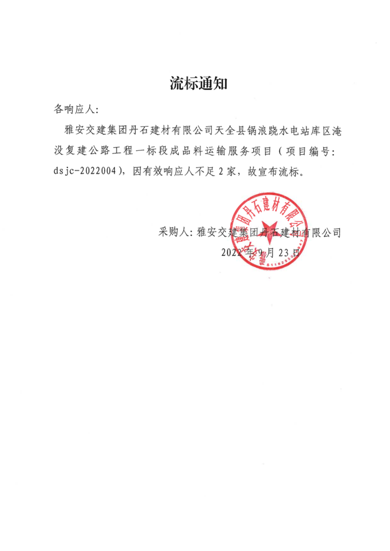 米兰体育-米兰(中国)官网 丹石建材有限公司天全县锅浪跷水电站库区淹没复建公路工程一标段成品料运输服务项目流标通知