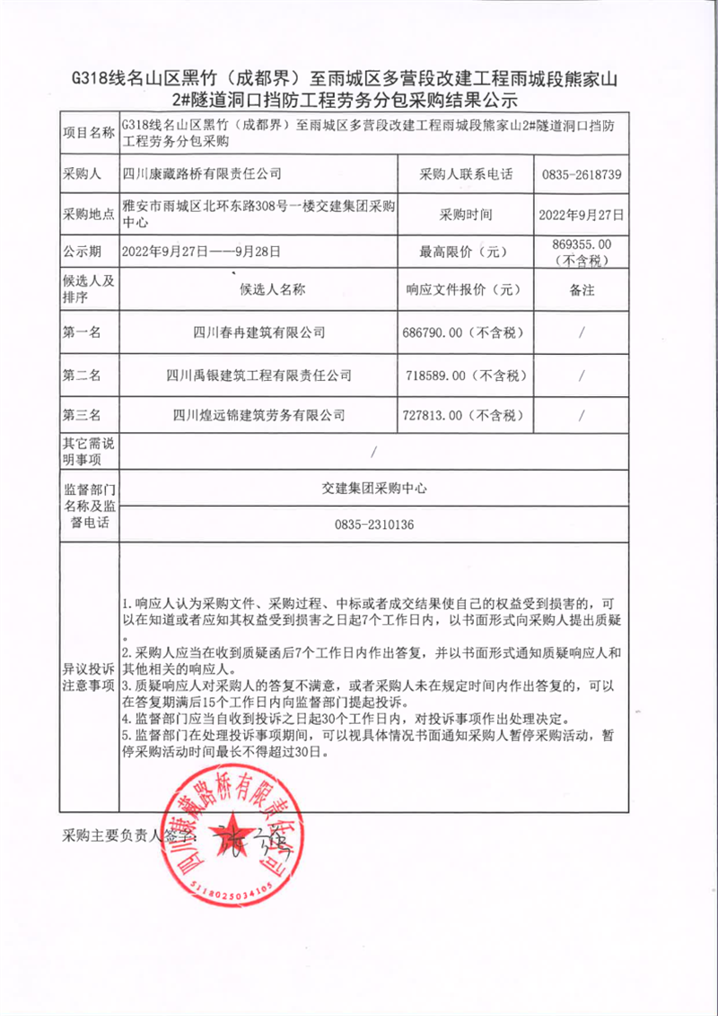 四川康藏路桥有限责任公司G318线名山区黑竹(成都界)至雨城区多营段改建工程雨城段熊家山2#隧道洞口挡防工程劳务分包采购结果公示