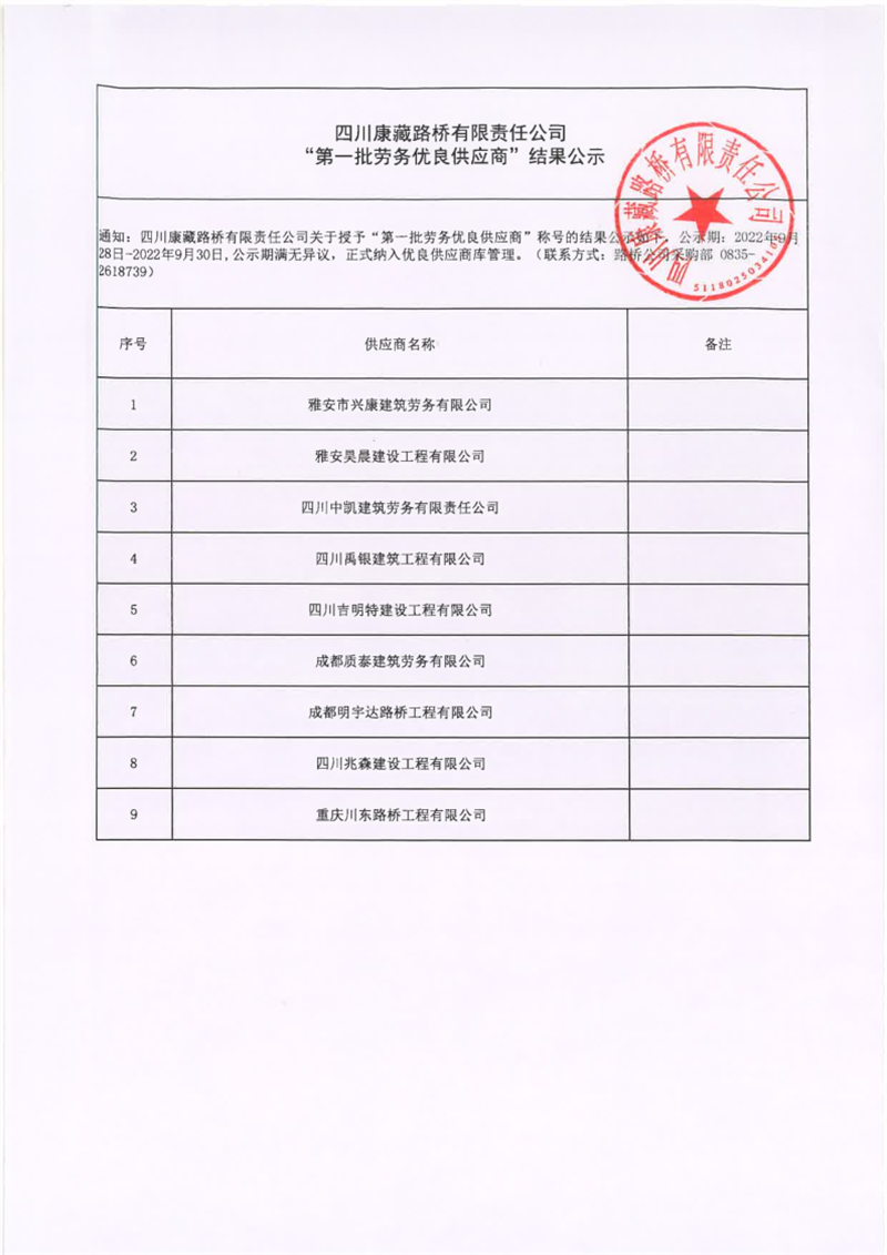 四川康藏路桥有限责任公司“第一批劳务优良供应商”结果公示