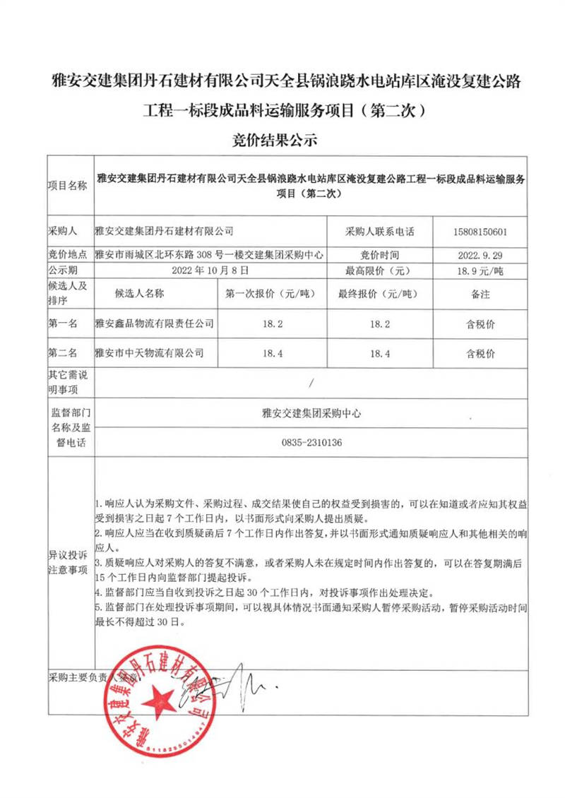 米兰体育-米兰(中国)官网 丹石建材有限公司天全县锅浪跷水电站库区淹没复建公路工程一标段成品料运输服务项目(第二次)竞价结果公示