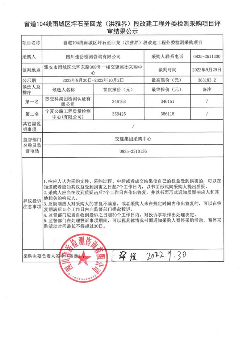 四川佳岳检测咨询有限公司省道104线雨城区坪石至回龙(洪雅界)段改建工程外委检测采购项目评审结果公示