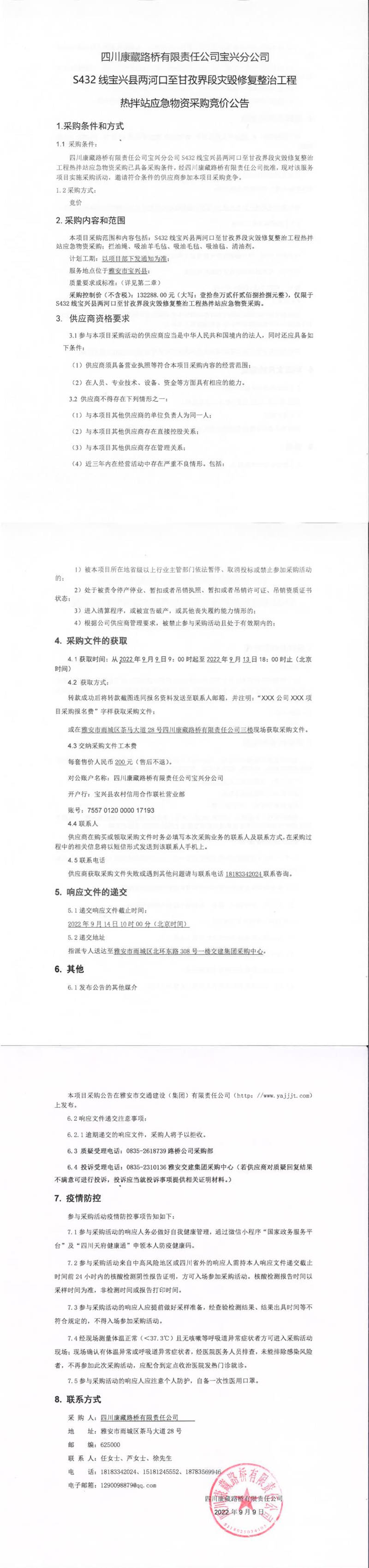 四川康藏路桥有限责任公司S432线宝兴县两河口至甘孜界段灾毁修复整治工程热拌站应急物资采购竞价公告