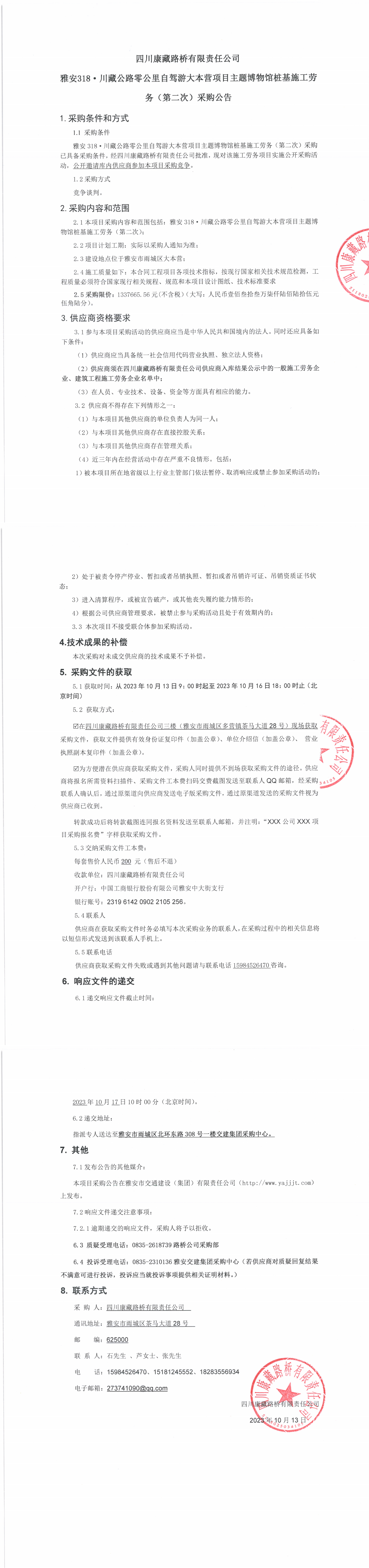 四川康藏路桥有限责任公司雅安318·川藏公路零公里自驾游大本营项目主题博物馆桩基施工劳务(第二次)采购公告