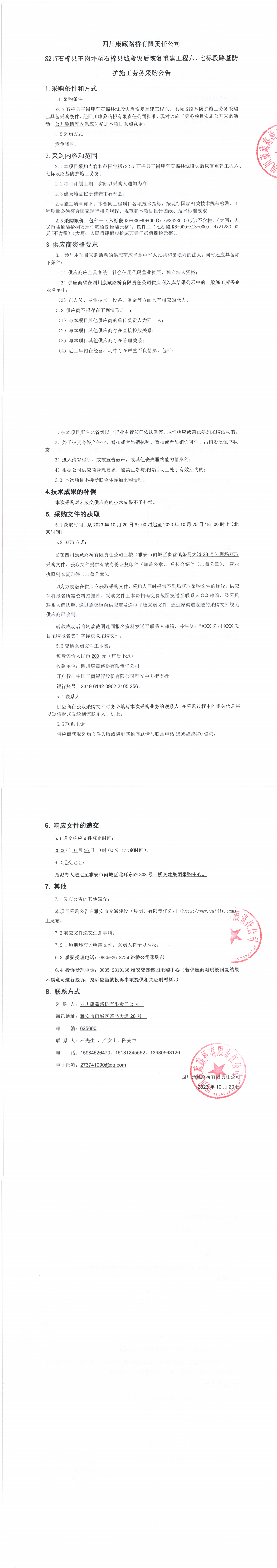 四川康藏路桥有限责任公司S217石棉县王岗坪至石棉县城段灾后恢复重建工程六、七标段路基防护施工劳务采购公告