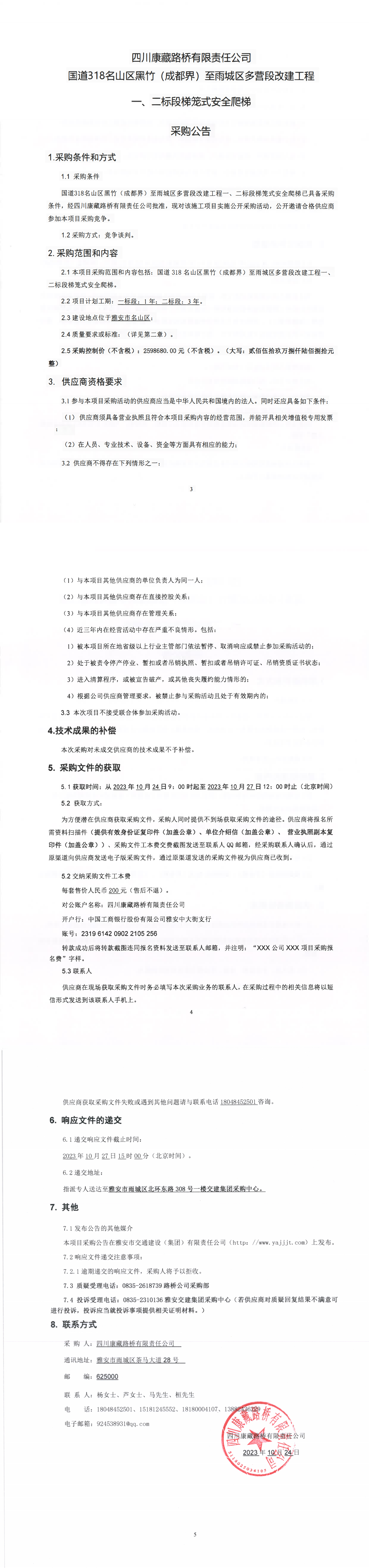 四川康藏路桥有限责任公司国道318名山区黑竹(成都界)至雨城区多营段改建工程一、二标段梯笼式安全爬梯采购公告