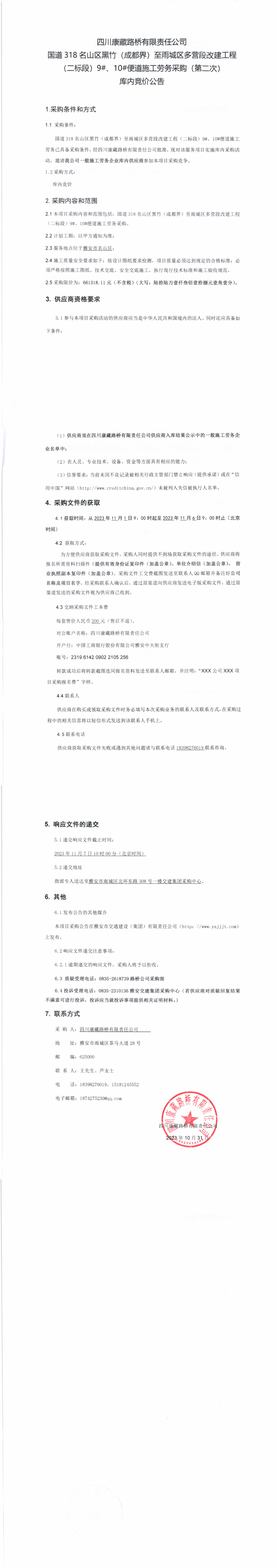 四川康藏路桥有限责任公司国道318名山区黑竹(成都界)至雨城区多营段改建工程(二标段)9#、10#便道施工劳务采购(第二次)库内竞价公告