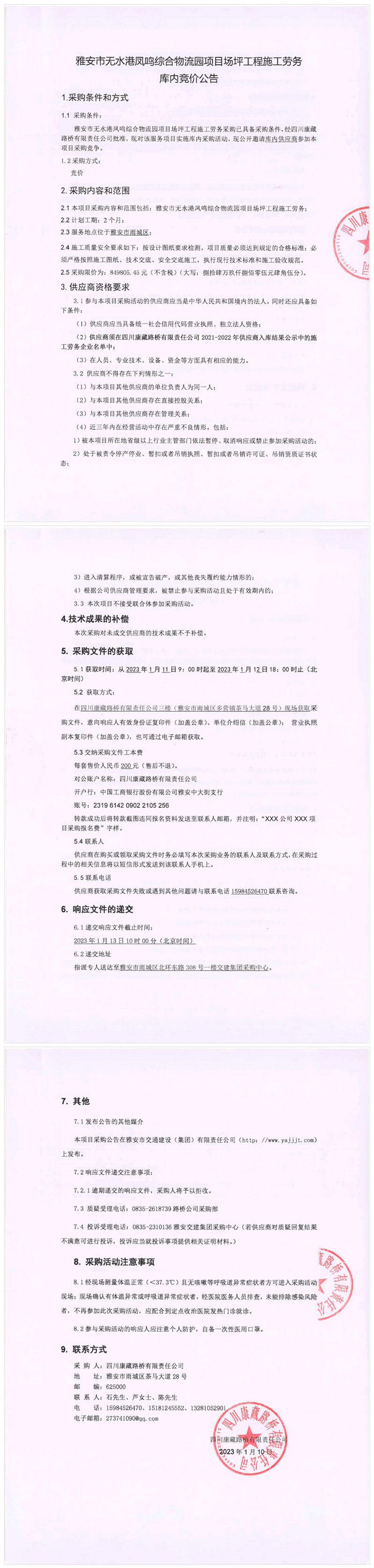 四川康藏路桥有限责任公司雅安市无水港凤鸣综合物流园项目场坪工程施工劳务库内竞价公告