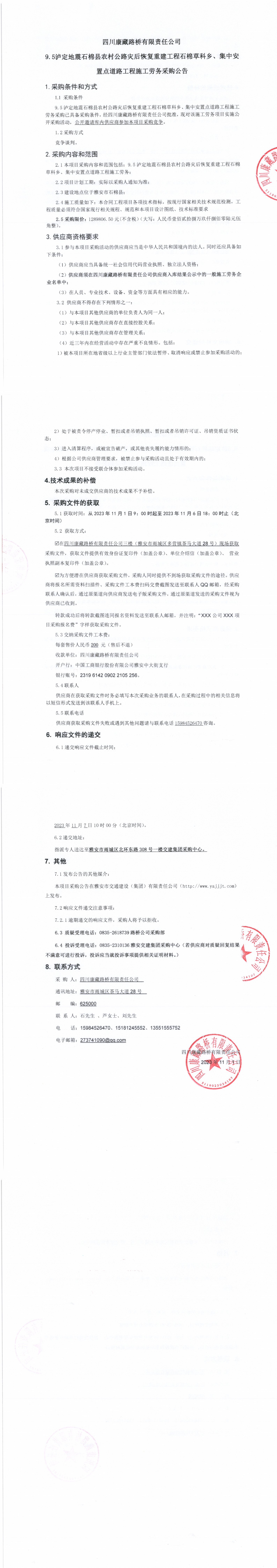 四川康藏路桥有限责任公司9.5泸定地震石棉县农村公路灾后恢复重建工程石棉草科乡、集中安置点道路工程施工劳务采购公告