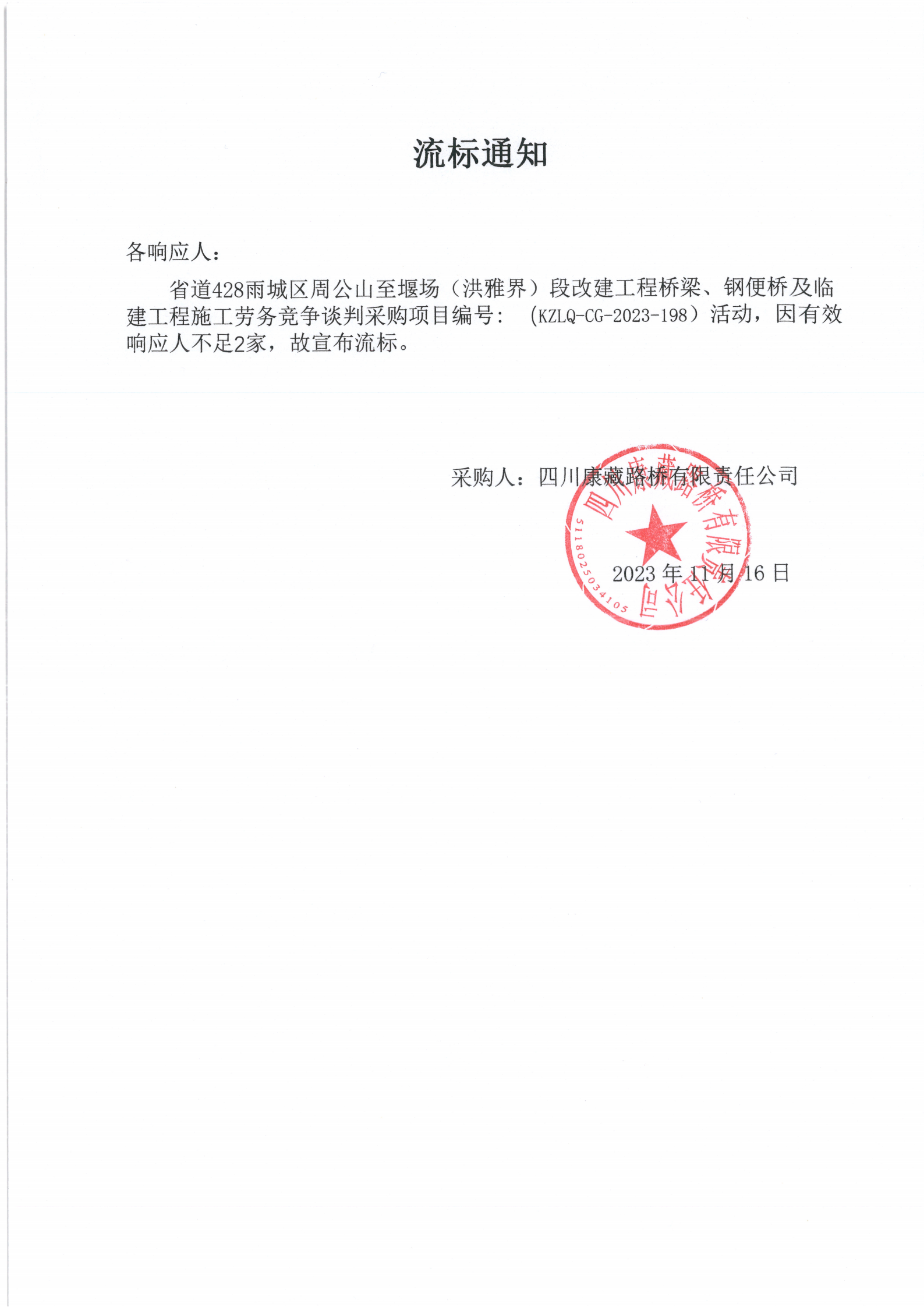 四川康藏路桥有限责任公司省道428雨城区周公山至堰场(洪雅界)段改建工程桥梁、钢便桥及临建工程施工劳务采购流标通知