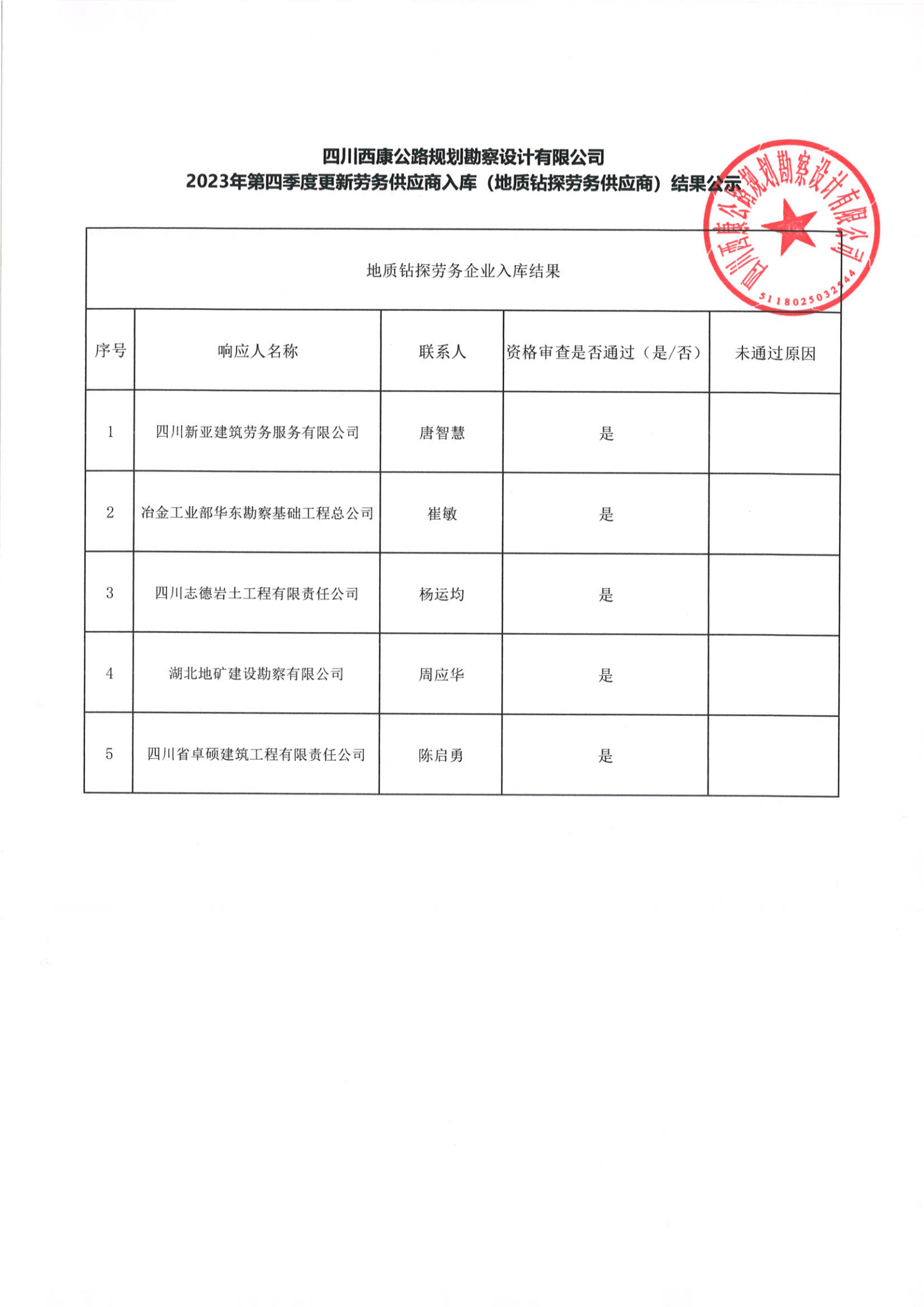 四川西康公路规划勘察设计有限公司2023年第四季度更新劳务供应商入库(地质钻探劳务供应商)结果公示