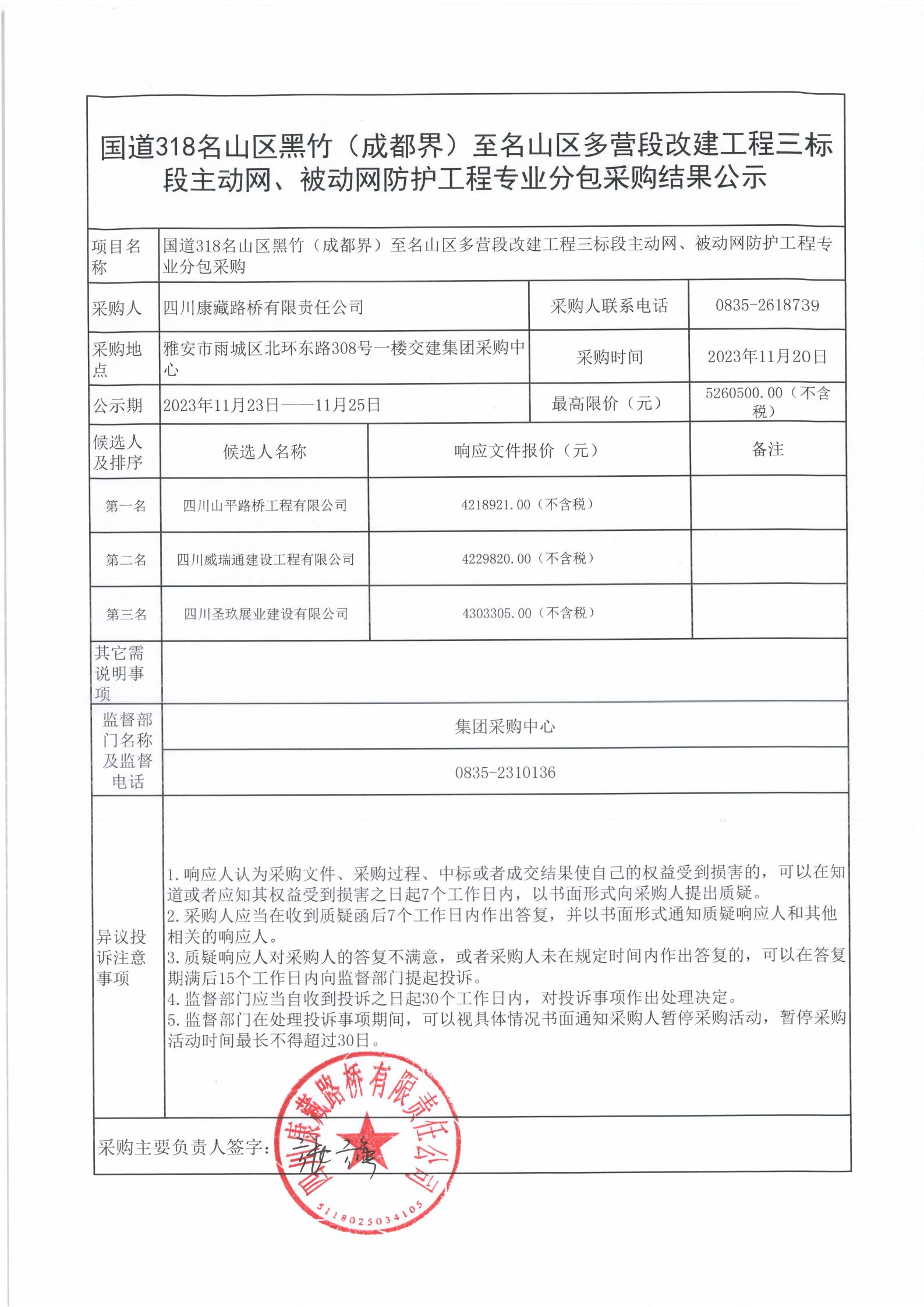 四川康藏路桥有限责任公司国道318名山区黑竹(成都界)至名山区多营段改建工程三标段主动网、被动网防护工程专业分包采购结果公示