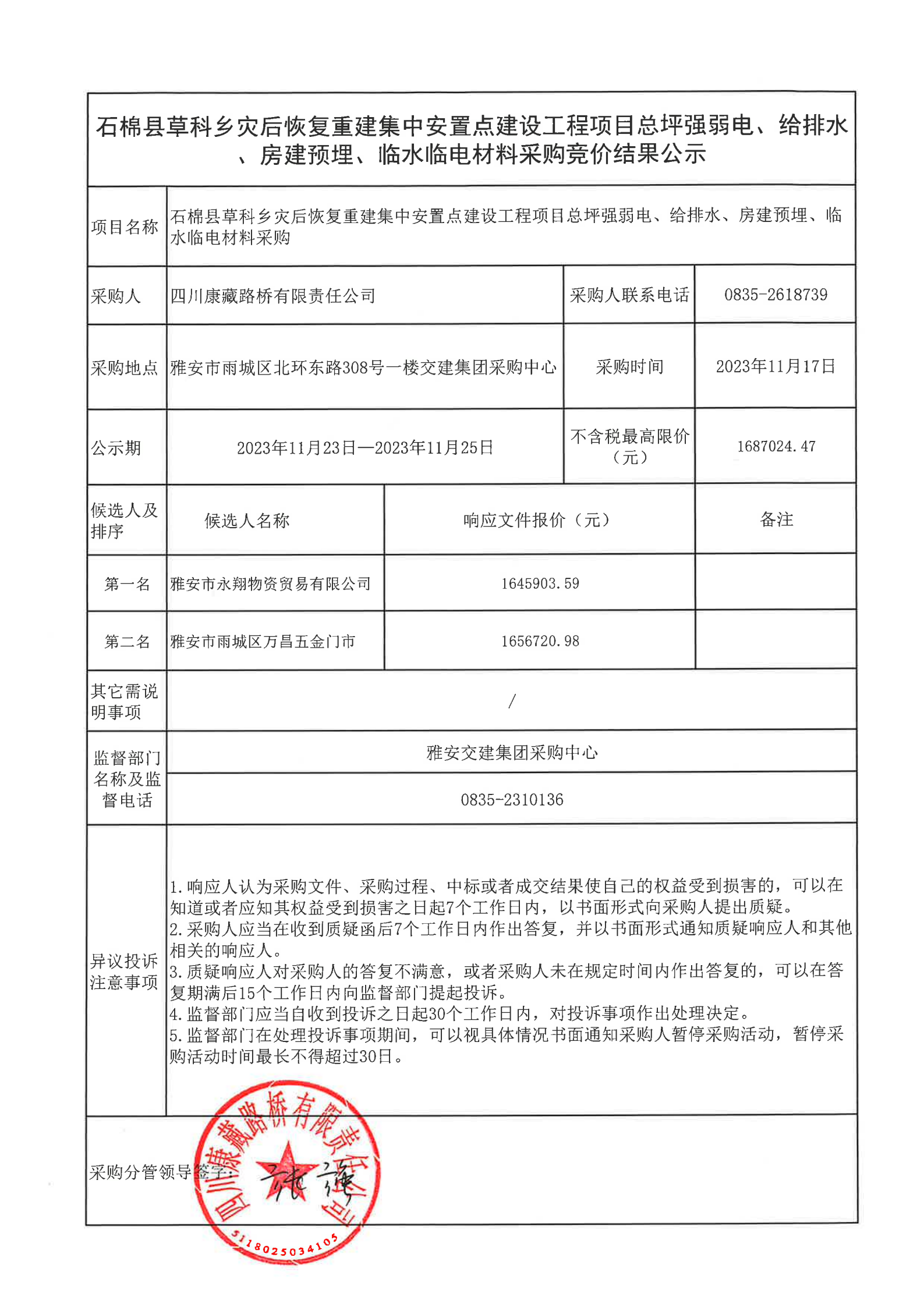 四川康藏路桥有限责任公司石棉县草科乡灾后恢复重建集中安置点建设工程项目总坪强弱电、给排水、房建预埋、临水临电材料采购结果公示