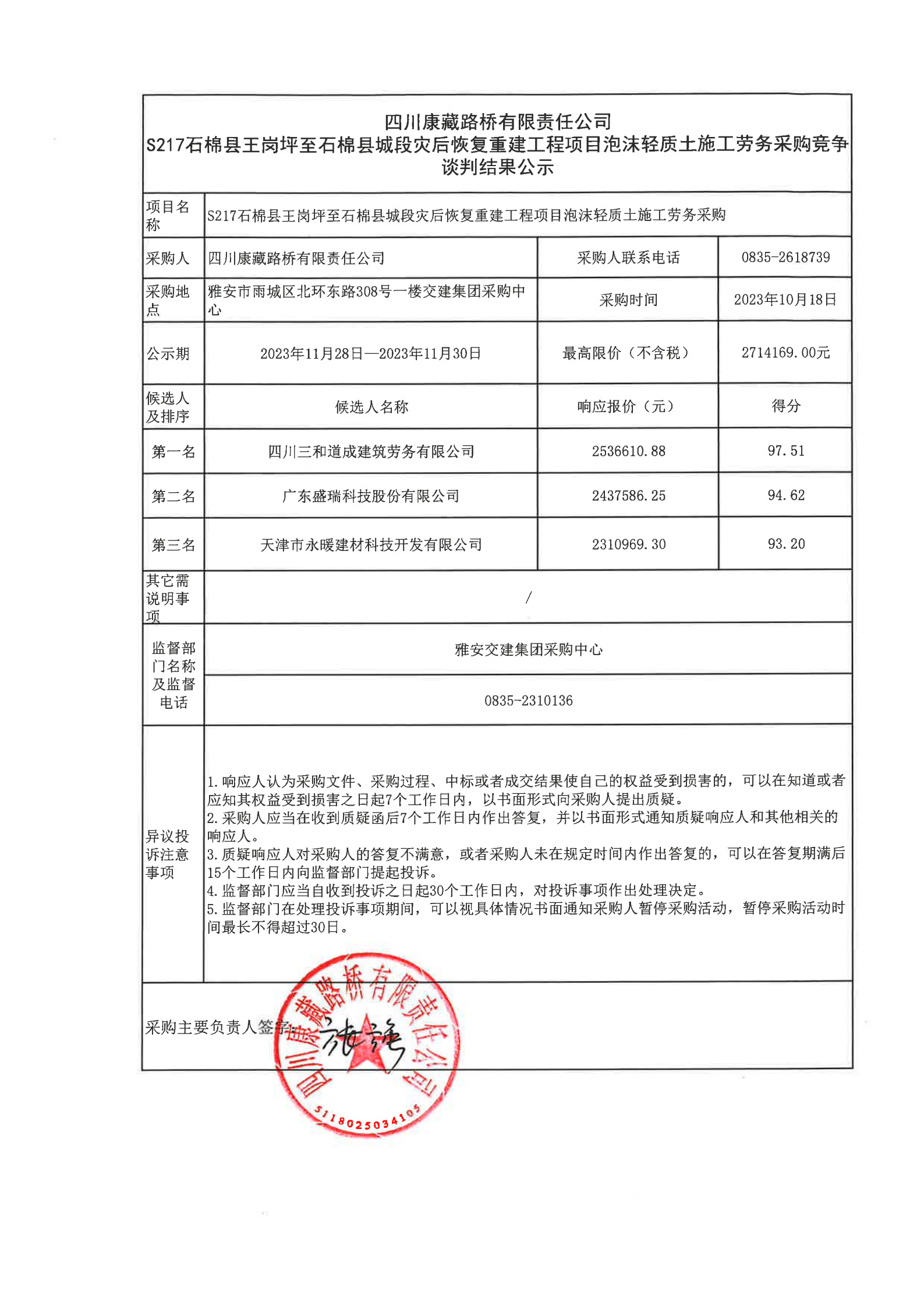 四川康藏路桥有限责任公司S217石棉县王岗坪至石棉县城段灾后恢复重建工程项目泡沫轻质土施工劳务采购结果公示