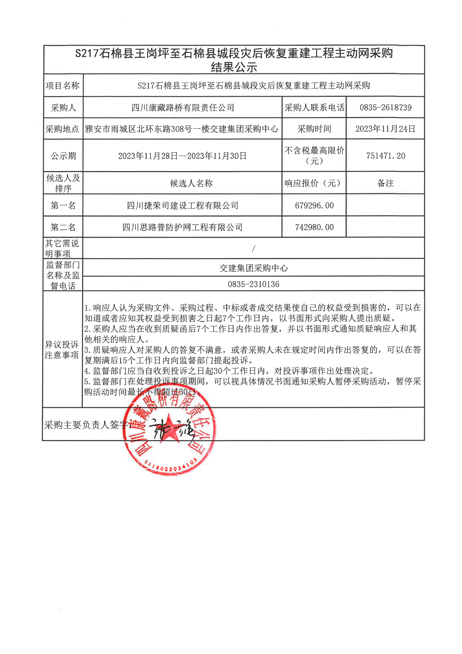 四川康藏路桥有限责任公司S217石棉县王岗坪至石棉县城段灾后恢复重建工程主动网采购结果公示