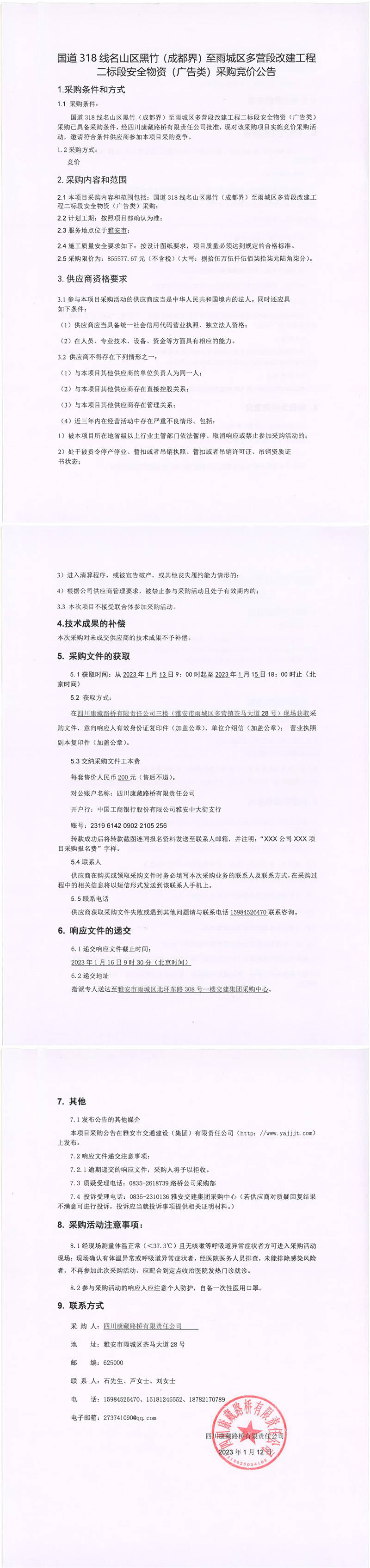 四川康藏路桥有限责任公司国道318线名山区黑竹(成都界)至雨城区多营段改建工程二标段安全物资(广告类)采购竞价公告