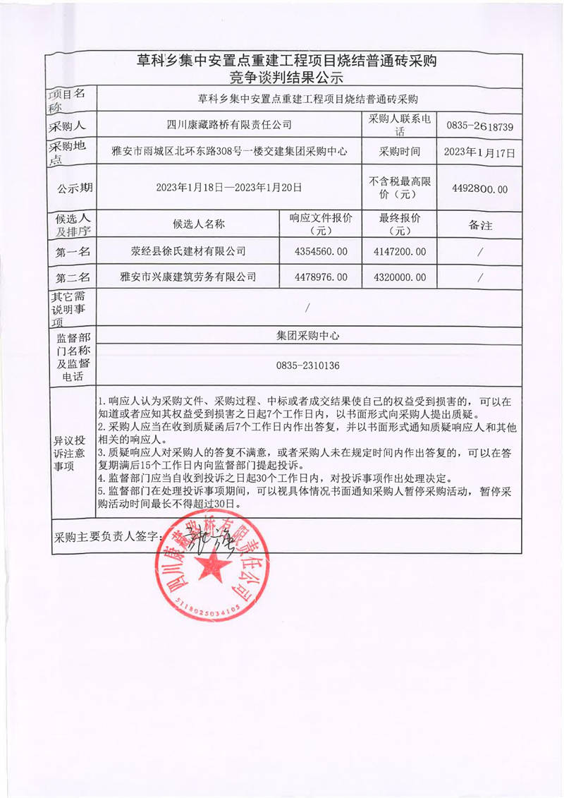 四川康藏路桥有限责任公司草科乡集中安置点重建工程项目烧结普通砖采购竞争谈判结果公示
