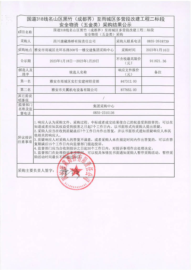 四川康藏路桥有限责任公司国道318线名山区黑竹(成都界)至雨城区多营段改建工程二标段安全物资(五金类)采购结果公示