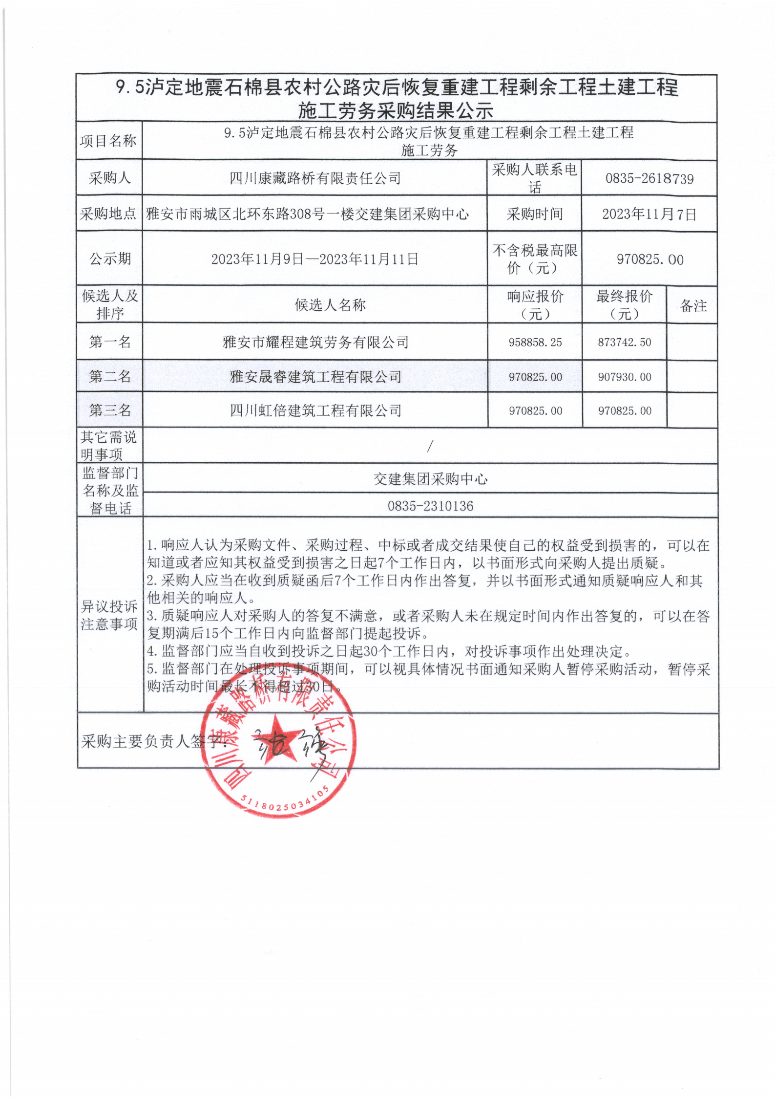 四川康藏路桥有限责任公司国道318名山区黑竹(成都界)至雨城区多营段改建工程二标段碎石桩施工劳务采购项目竞争谈判结果公示