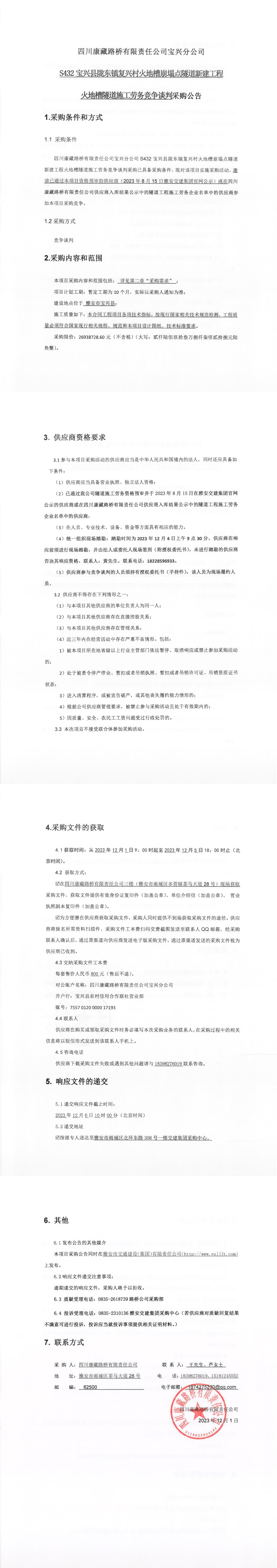 四川康藏路桥有限责任公司宝兴分公司S432宝兴县陇东镇复兴村火地槽崩塌点隧道新建工程火地槽隧道施工劳务竞争谈判采购公告