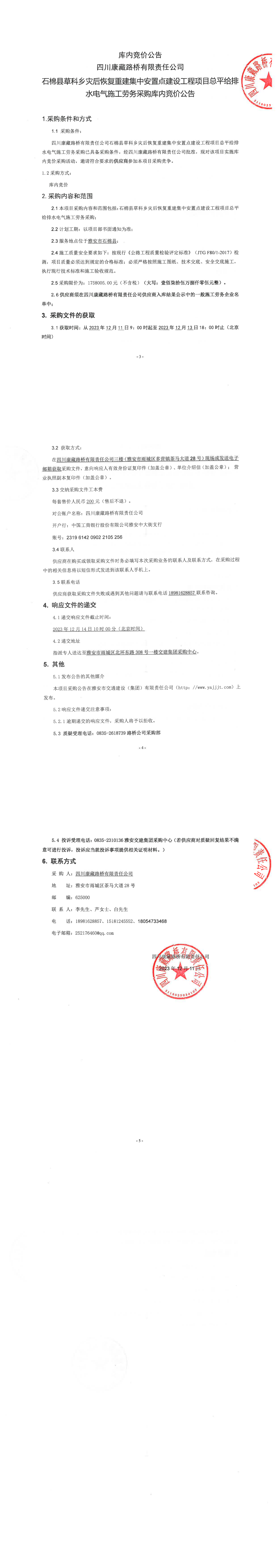 四川康藏路桥有限责任公司石棉县草科乡灾后恢复重建集中安置点建设工程项目总平给排水电气施工劳务采购库内竞价公告