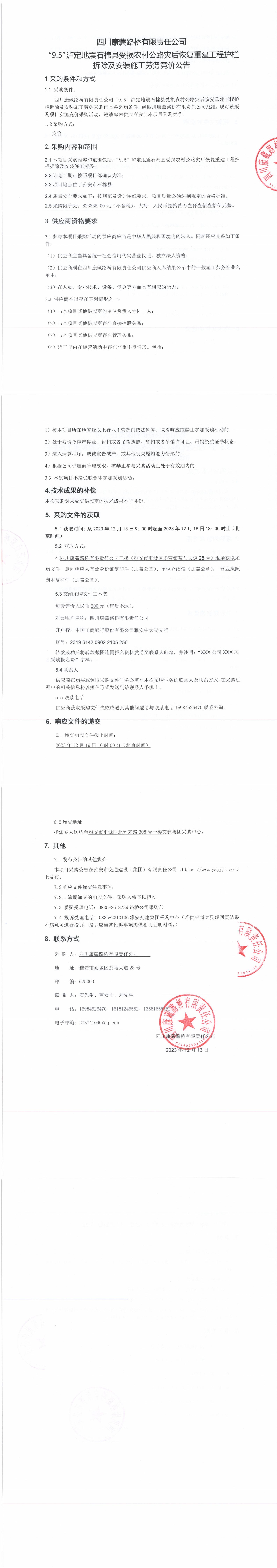 四川康藏路桥有限责任公司“9.5”泸定地震石棉县受损农村公路灾后恢复重建工程护栏拆除及安装施工劳务竞价公告