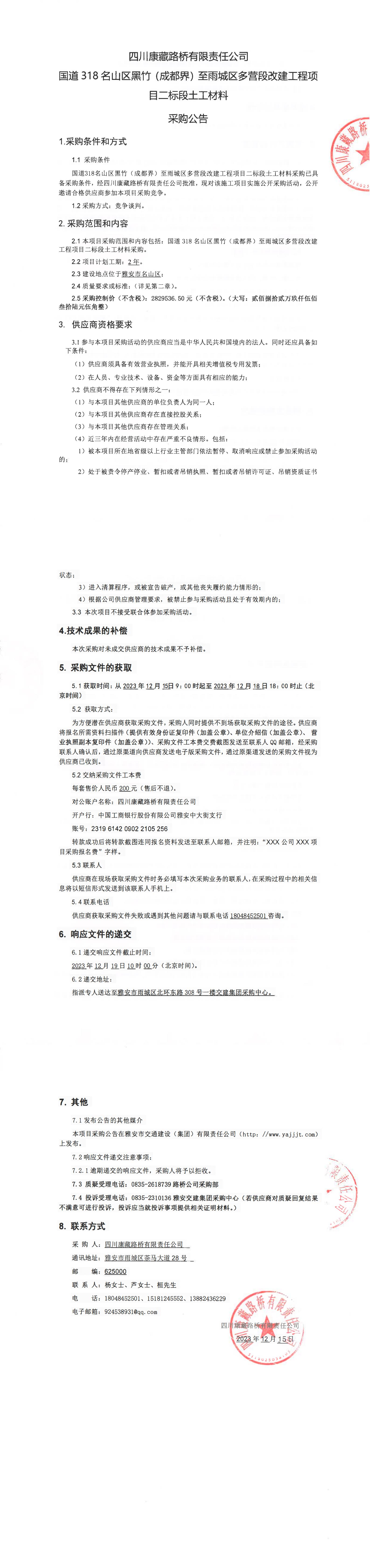 四川康藏路桥有限责任公司国道318名山区黑竹(成都界)至雨城区多营段改建工程项目二标段土工材料采购公告
